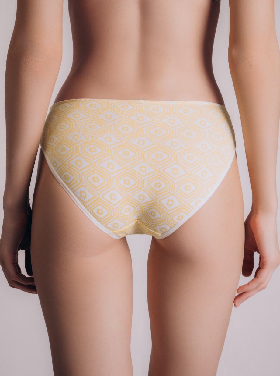 Мягкие трусы-слипы Indefini из хлопка.C оригинальным желтым узором.Трусы средней посадки держатся на талии мягкой кружевной резинкой белого цвета.