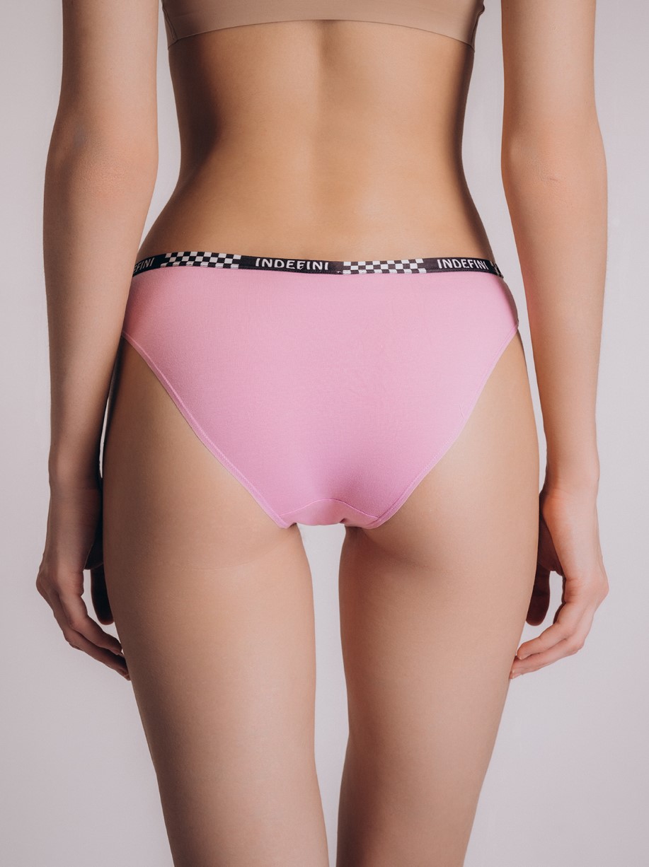 Розовые трусы-слипы от бренда Indefini с ярким принтом и надписью "GOOD LUCK" на передней части. Модель выполнена из мягкого хлопка с добавлением эластана, что обеспечивает отличную посадку и комфорт в течение дня. Эластичная резинка с фирменным логотипом и контрастным узором надежно фиксирует изделие на талии, не сдавливая кожу.