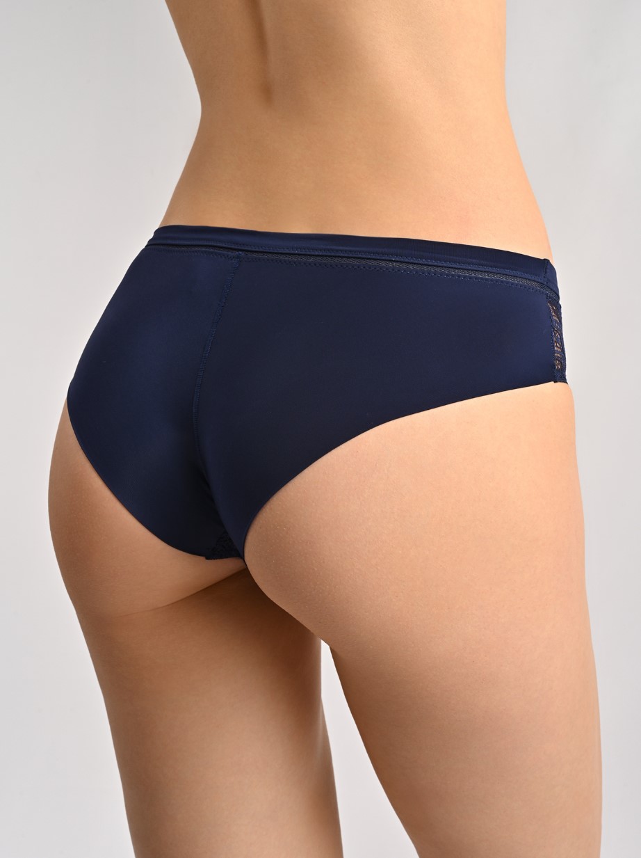 Кружевные трусы бразилиано из эластичного полиамида — прекрасный выбор для ценителей женственного нижнего белья. Резинка не оставляет следов на коже. Глубокий оттенок синего цвета, средняя посадка и частично открытая зона ягодиц придают образу неотразимую притягательность, а небольшое количество эластана в составе делает белье долговечным и тянущимся.