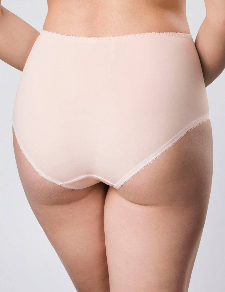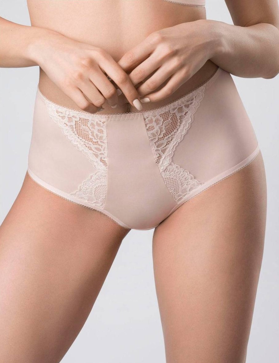 Трусы слипы с завышенной линией талии и широким бочком в цвете «крем-брюле», выполнены из мягкого гладкого эластичного полотна с микрофиброй и вставок эластичного кружева на передней детали. Срезы обработаны мягкой трикотажной резинкой «пикот». Прокладка ластовицы хлопковая.