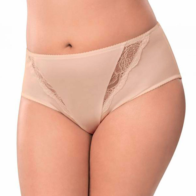 Женские трусы, модель слипы из эластичного полотна и эластичного кружева с высокой линией талии. Передняя деталь продублирована подкладкой из эластичной сетки. По срезам и поясе трусы оформлены окантовочной резинкой с фестонами. Ластовица из хлопка.