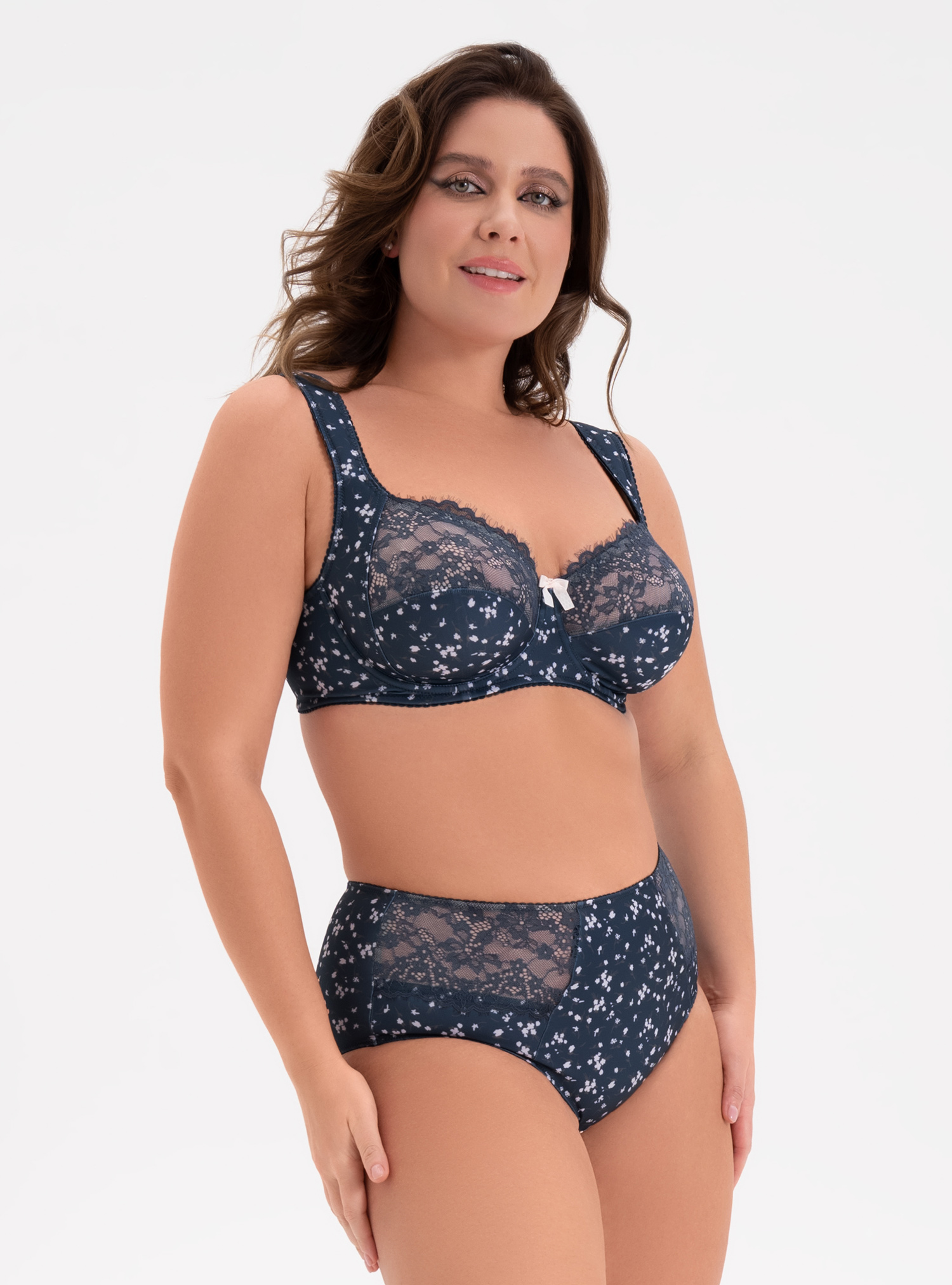 Трусы-слипы с высокой посадкой выполнены из эластичного принтованного полотна и кружева