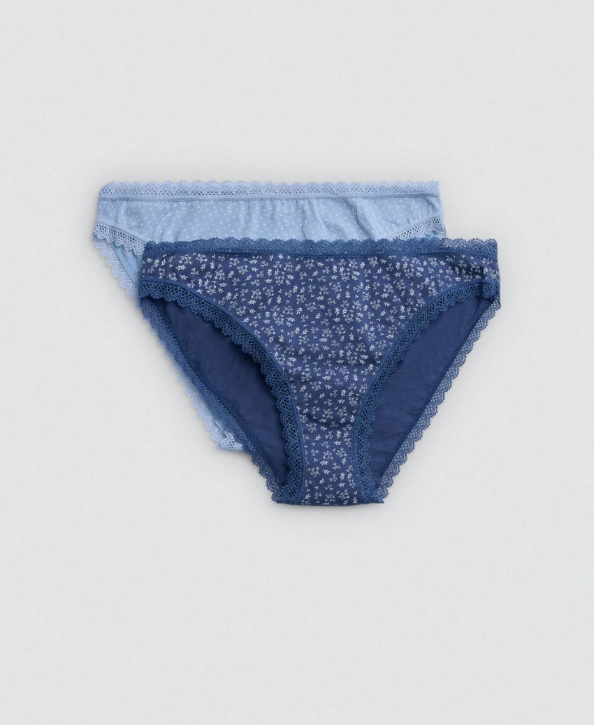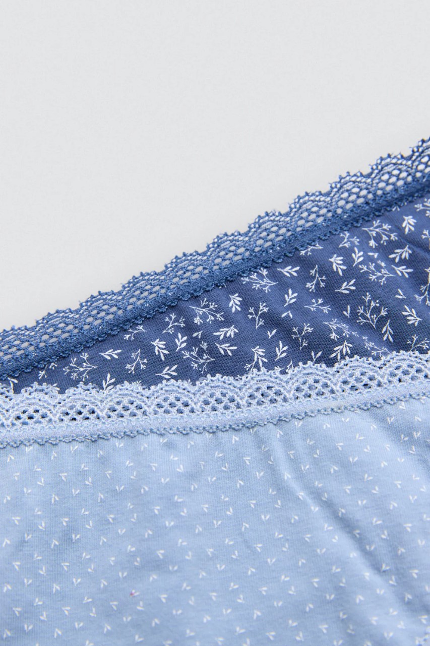 В упаковке 2 мини-трусика из натурального хлопка, которые отличаются особой мягкостью и эластичностью. В этот набор входят два варианта в синих оттенках с нежным цветочным принтом и элегантной кружевной отделкой. Идеальное сочетание комфорта и женственного стиля для повседневной носки.