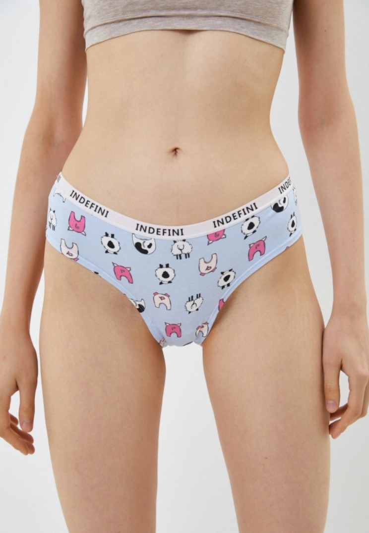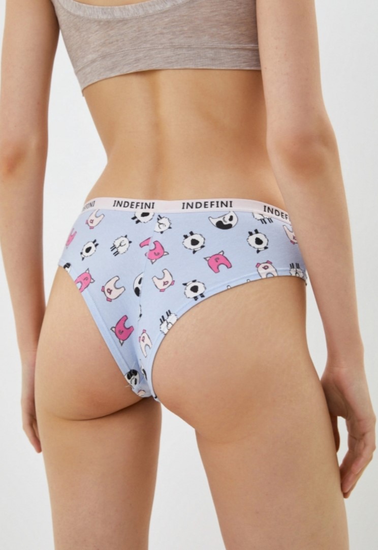 Женские трусы от торговой марки Индефини. Трусы-танга из хлопка, голубого цвета, с принтом, на мягкой резинке, средней посадки.