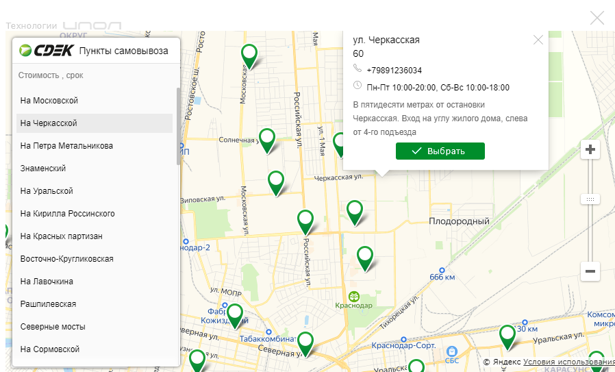 Нажмите на кнопку «Выбрать пункт самовывоза» и укажите на карте или выберите из списка пункт самовывоза, который наиболее удобен для Вас.
